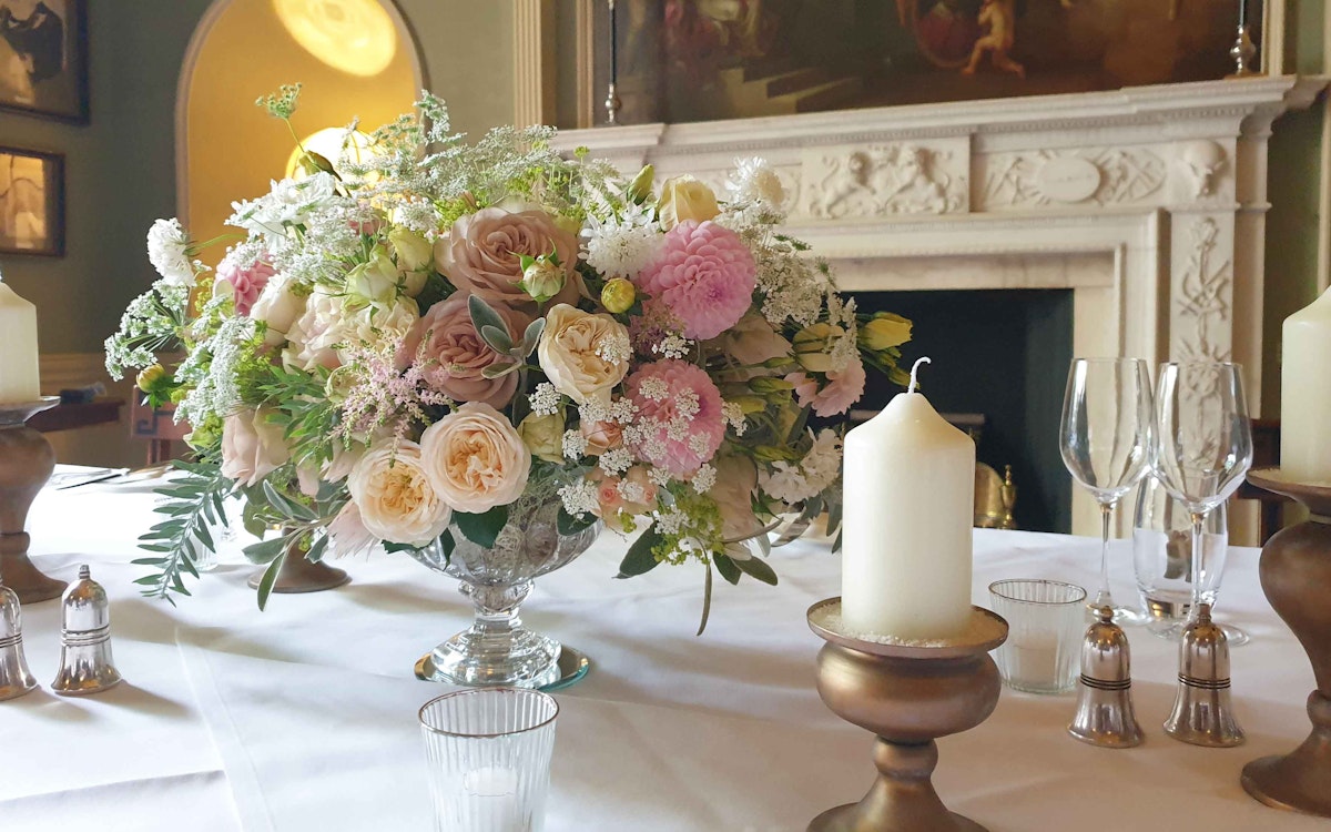 Our most memorable wedding to date happened on the run up to Christmas last year & had a brief that requested a Parisian styled winter wonderland. For the wedding breakfast we created a stylish selection of towering domed floral canopy's as well as lower floral table gardens to decorate the guest tables & for the bride and groom, we provided beautiful tall gold candelabra's that were generously draped with heavily flowered foliage garlands. Each of the tables were covered in both blush & cream tall taper candles as well as twinkling tea lights & just outside this room where the drinks receptions would take place, we filled the space with a forest styled selection of fairy light laden Christmas tree's in every size you could possibly imagine. Both of the areas within the venue really did look stunning & the wedding party had a truly fantastic day! job done, in style, as always!