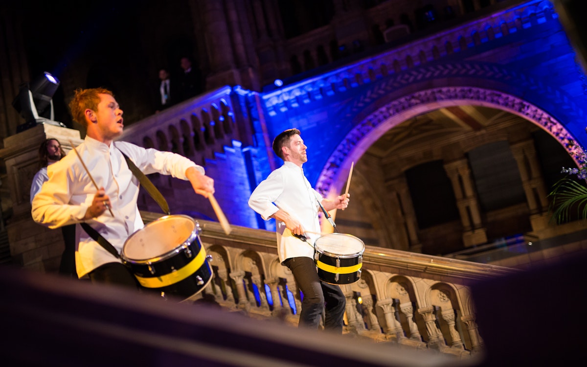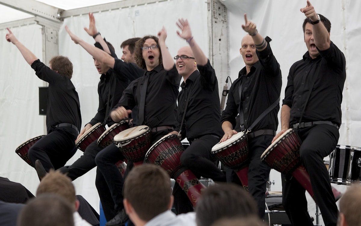 The Drum Waiters provide after dinner and party entertainment in a fresh, highly animated and inventive way. Dressed as waiters and helping serve dinner guests prior to the performance, at the appointed time they subtly start to reveal their true colours. Spread around the room, the first 'waiter' starts to clap a rhythm that is picked up by each of the others in turn. At first there is a degree of uncertainty amongst the guests as to what exactly is happening, but as soon as the waiters produce saucepans and cutlery to create impressive beats they quickly become caught up in the atmosphere. The show proceeds with skillfully choreographed moves, a variety of drums, including large water butts, and some familiar rhythms – We Will Rock You is always guaranteed to get the guests going. The performance ends with a powerful high speed finale on drum kit and tom toms.
