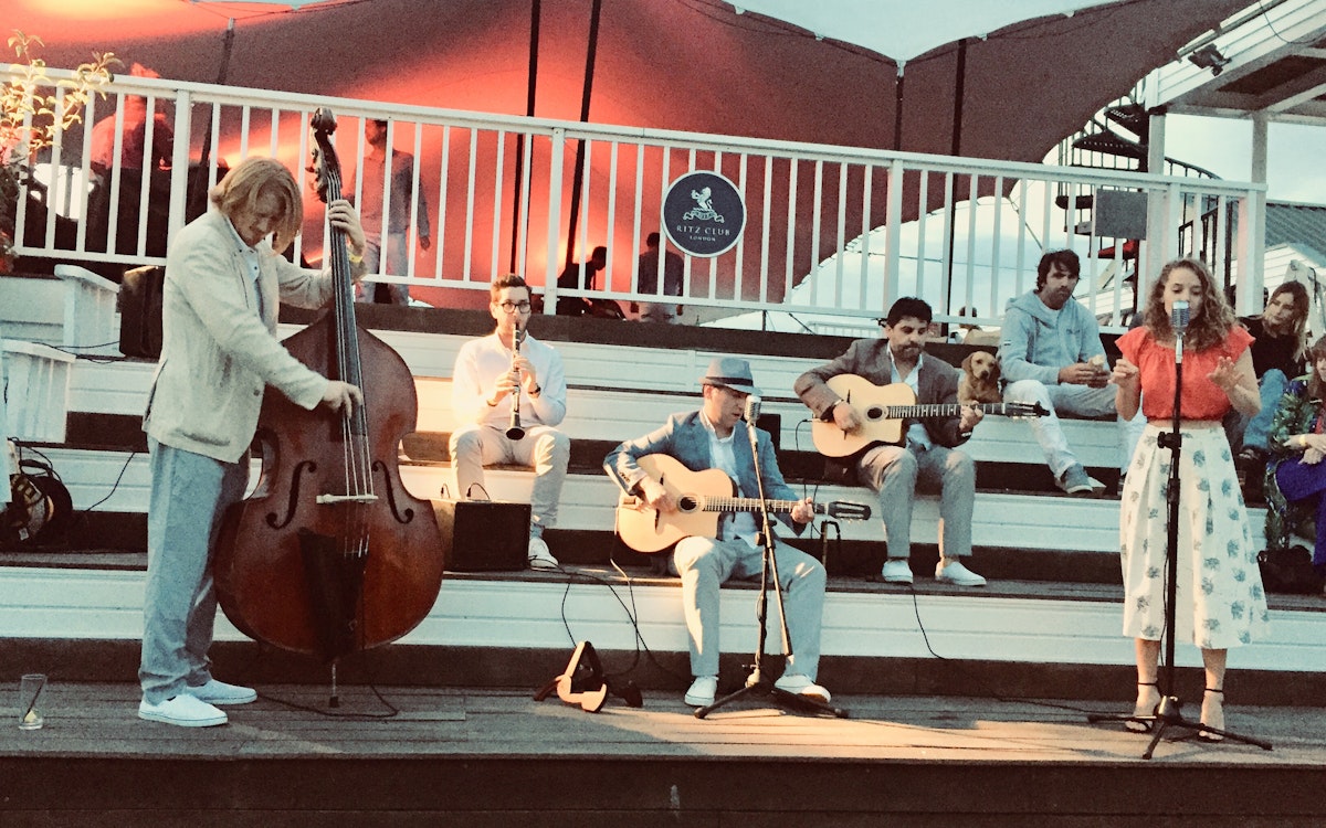 At Zac Goldsmith's wedding, Petersham Nurseries performing in front of Sting amongst other high profile guests. Sting was extremely complimentary about the band remarking: "Excellent! Your band swings beautifully."