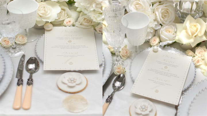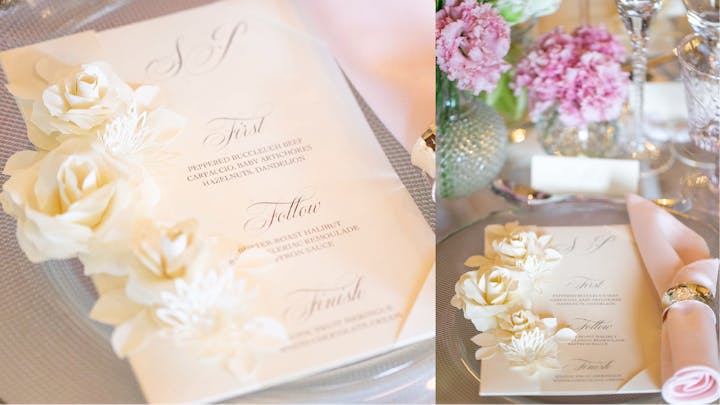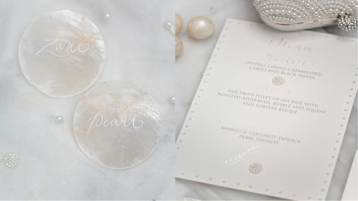 - Beyond paper. We have seen a trend for looking beyond paper, and your tablescape can have beautiful objects that can be personalised and treasured as keepsakes even after the event has taken place. Last year alone we worked with paper, vellum, acrylic, stone, slate, wood, and wax - we love experimenting with new ideas. We’ve also seen beautiful designs using agate (for example, agate placecards with names written in calligraphy), mother of pearl shells, tropical leaves (for placecards and table names) tiles, glass, and many more. Don’t be afraid to think outside of the box – if you can dream it, a stationer can probably create it!