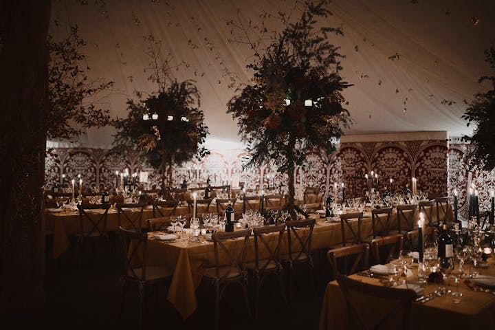 - What flowers did you go for and how did you choose? Tattie Rose Flowers. After meeting her and showing her pictures of the marquees, she put together a fantastic proposal and mood board for the church and marquees, which included Christmas trees and an amazing spectacle of flowers and leaves hanging from the marquees