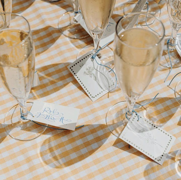 We love the idea of escort cards. These are a great alternative to the table plan, with guest names on the front and table names on the back. Check out Embellishing the Ordinary's beautifully designed escort cards on wedding guests' champagne flutes...
